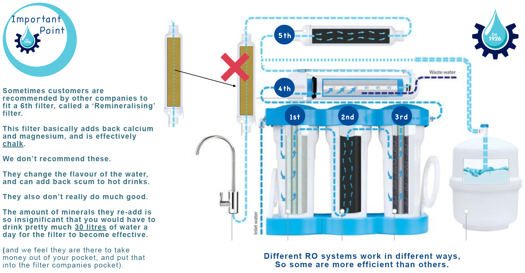 Sometimes, you might be advised — usually by other companies — to add a sixth filter to your RO system called a “remineralising filter".